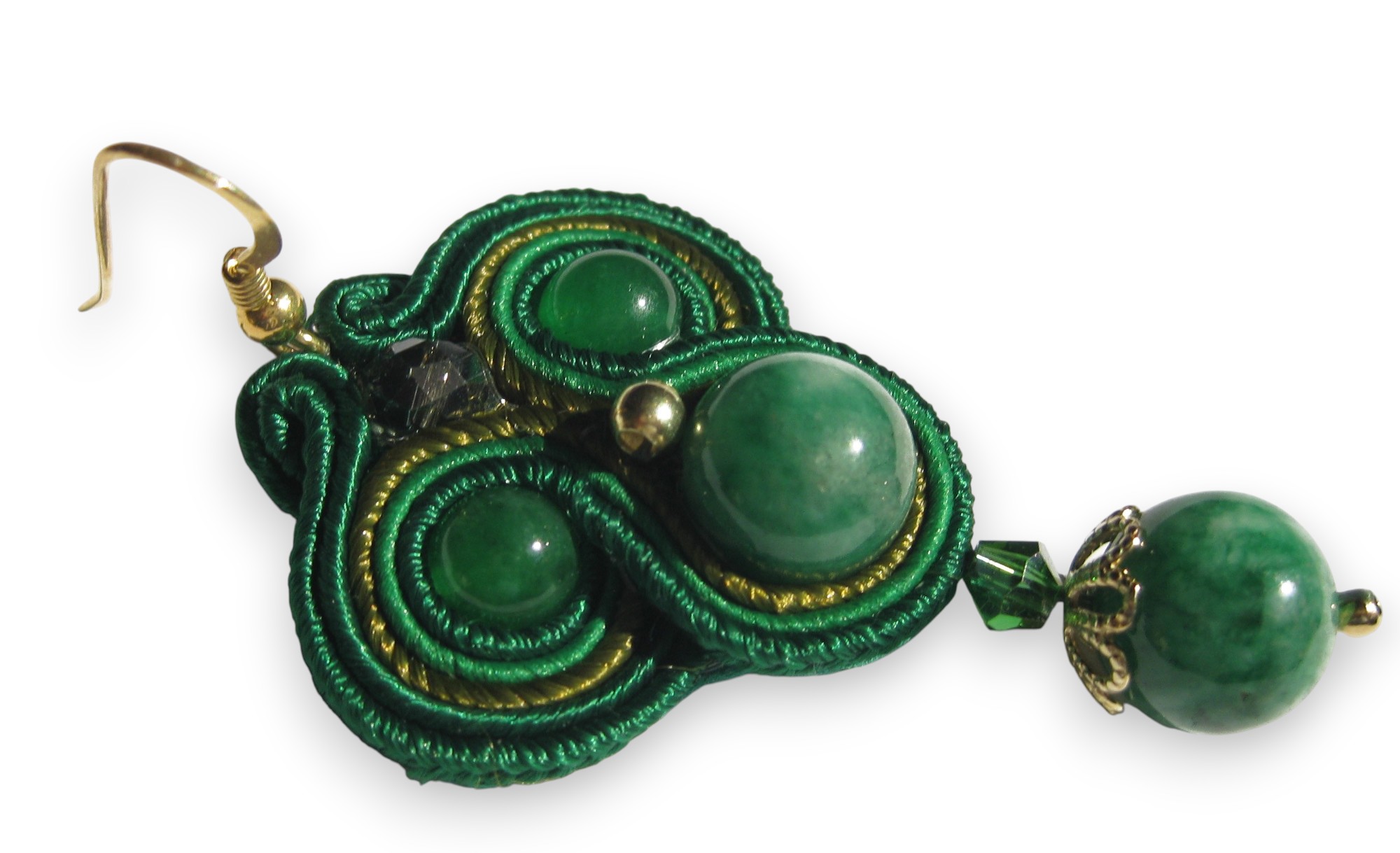 Orecchini realizzati a mano con tecnica sartoriale che consentono di assemblare una fettuccia di seta e viscosa con pietre naturali, cristalli e argento. Chiusura con amo in acciaio. Il colore delle pietre, essendo naturali, può avere una lieve variazione.